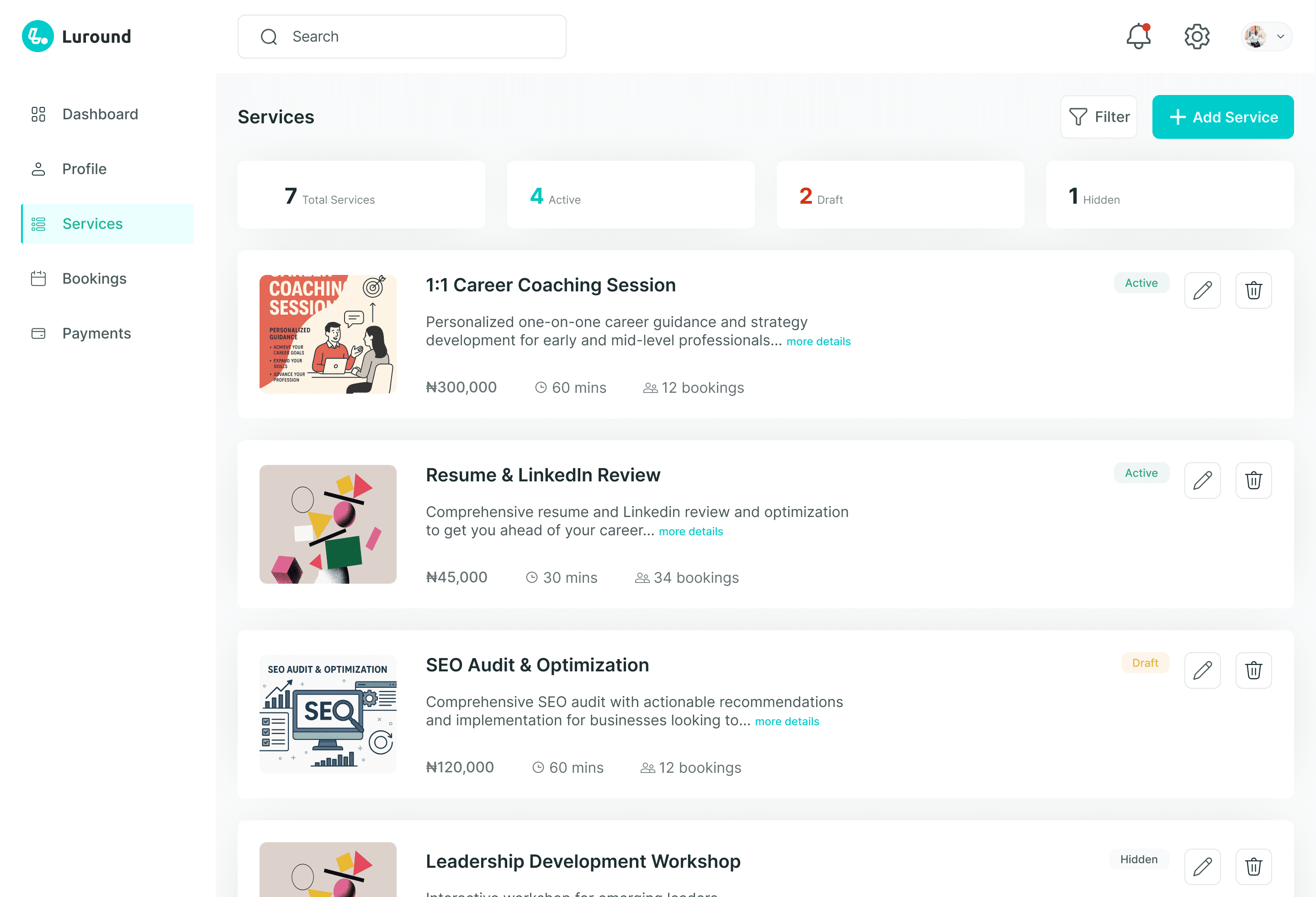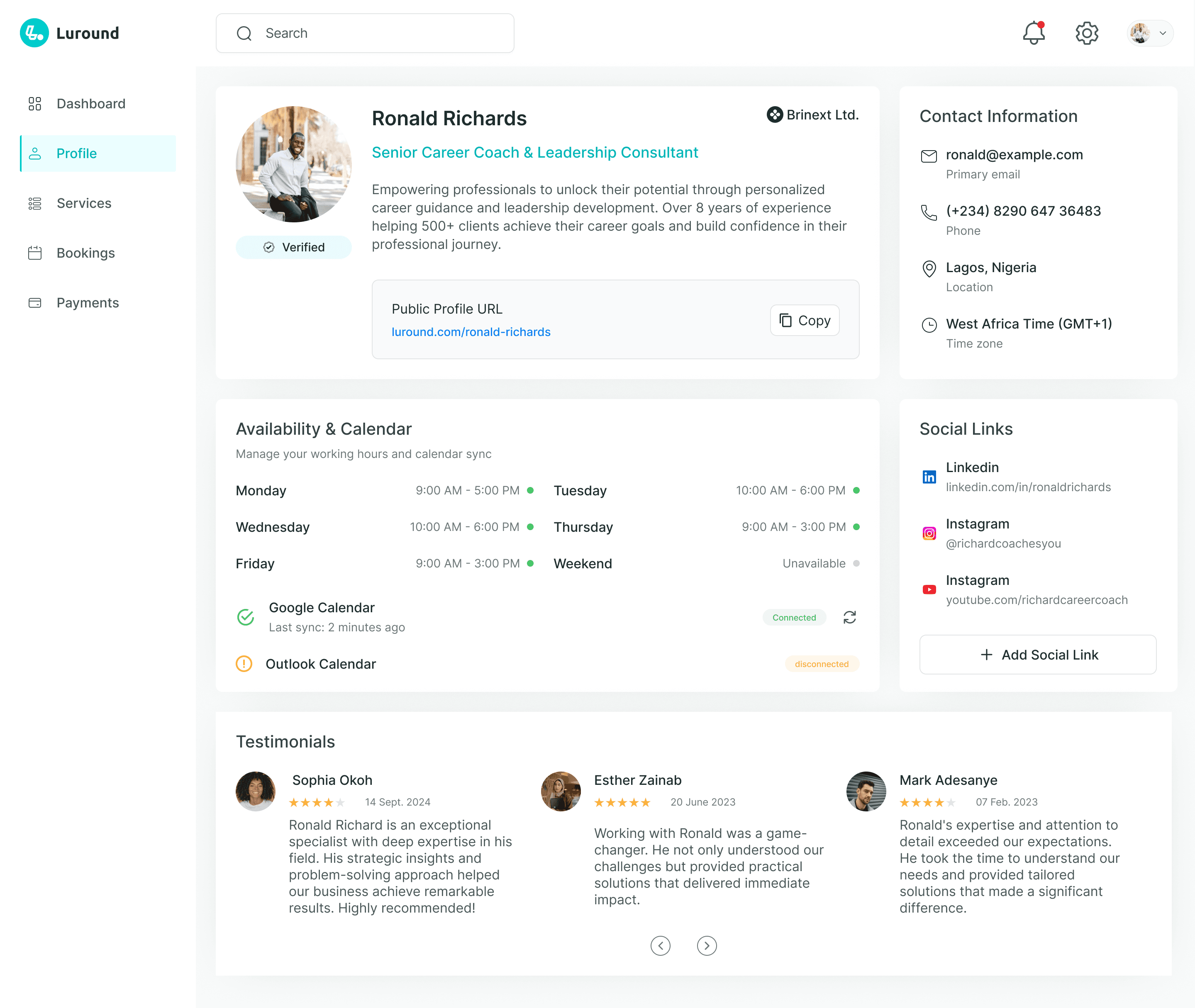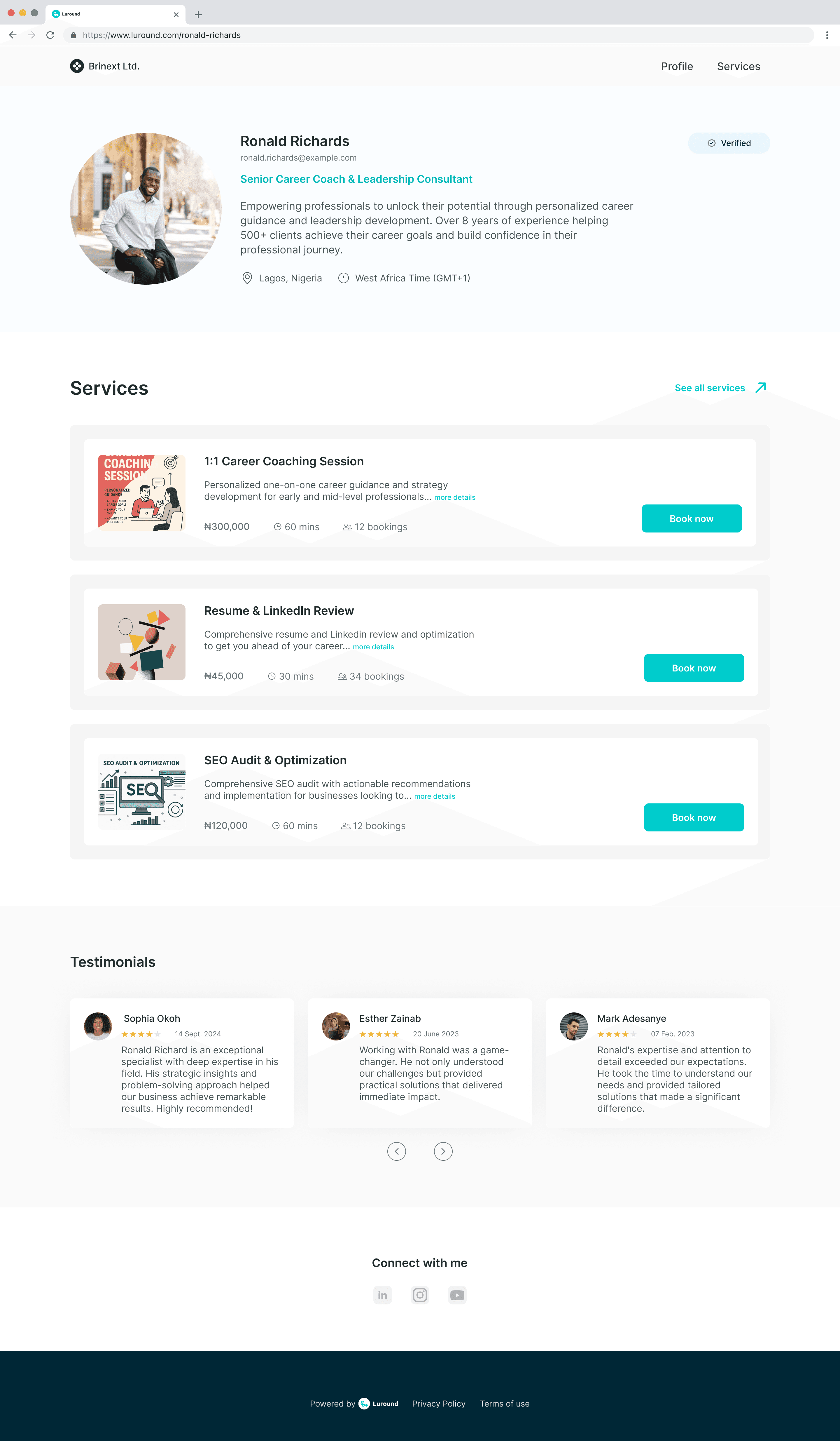 Luround allows users to create a branded profile showcasing their services, and clients can book sessions based on real-time availability.