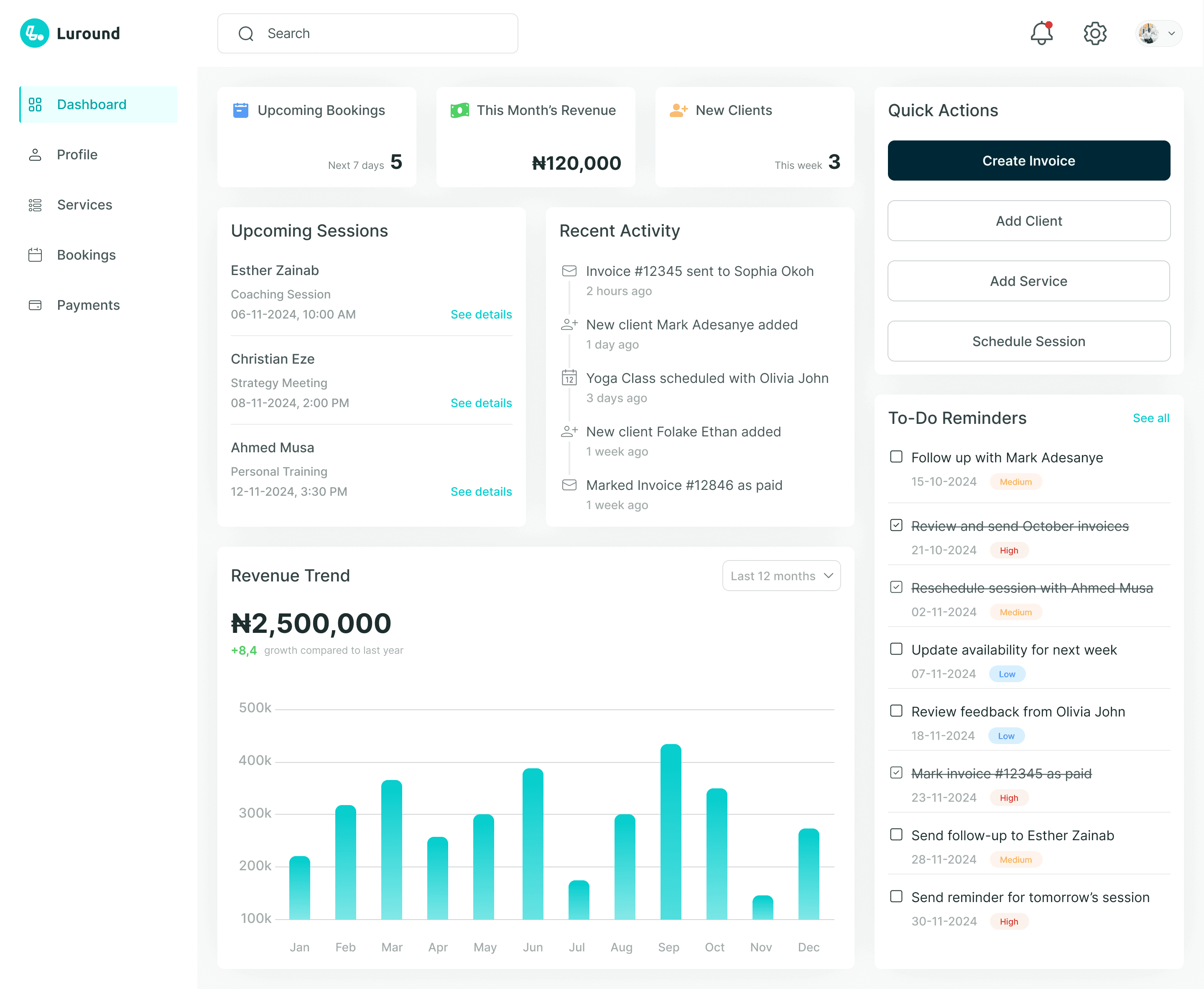 Luround is an all-in-one client management platform designed to help coaches, consultants, and trainers simplify how they book clients, track payments, and manage services.