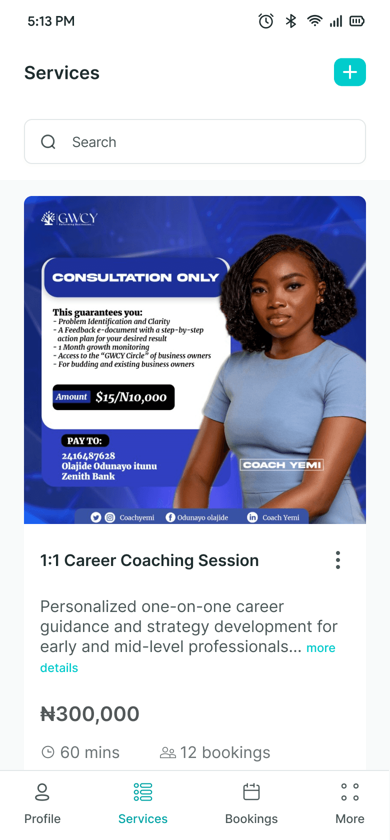 We prioritized a mobile-first design, as 90% of users operated their businesses from their phones, and mapped the product into 5 core experiences: Profile, Services, Bookings, Payments, and Dashboard.